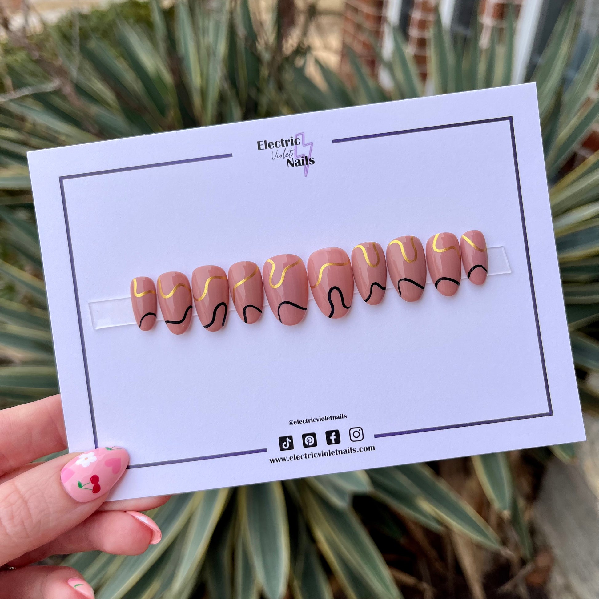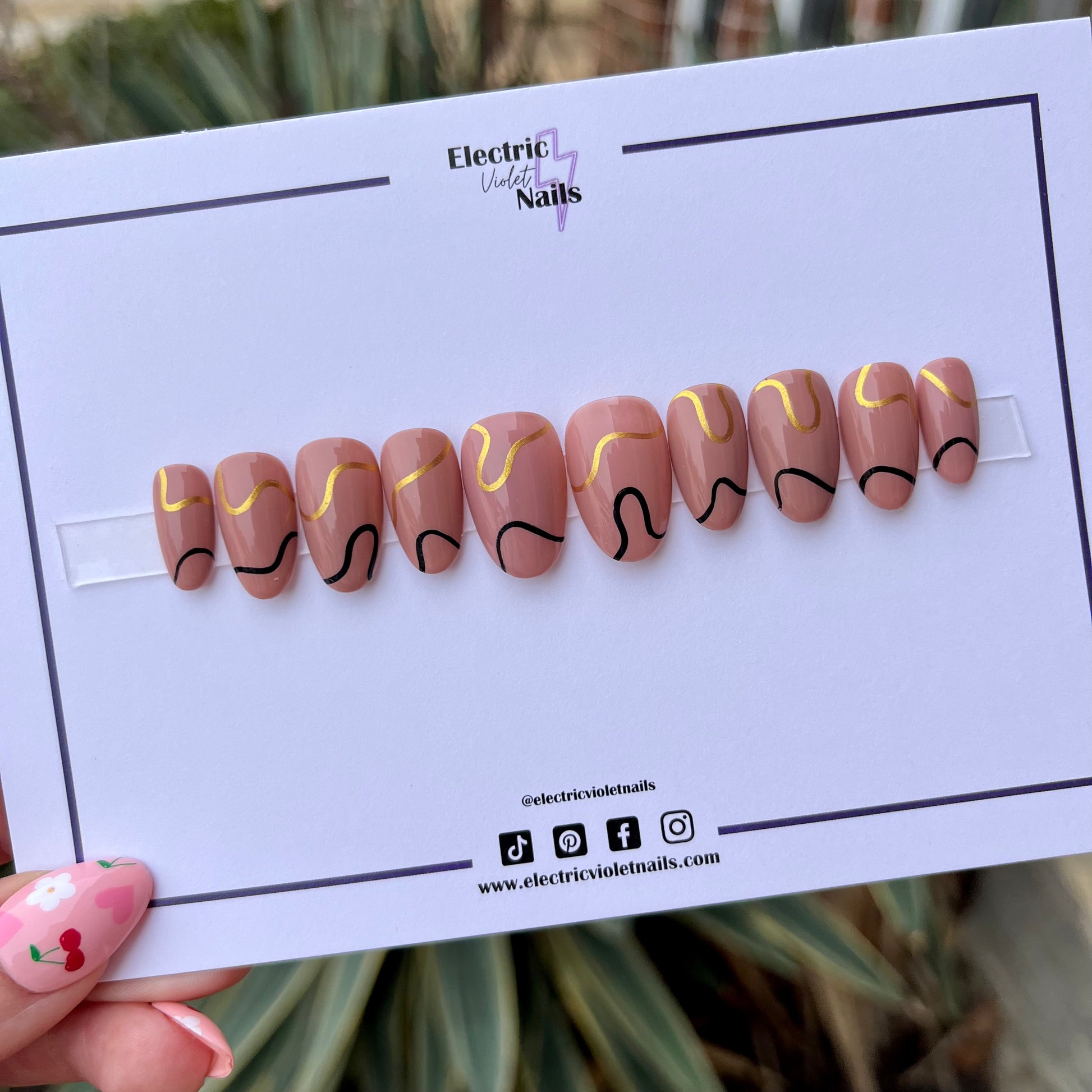 Set Description: Set of 10 custom sized press-on nails. Nude background with yellow gold and black swirls.