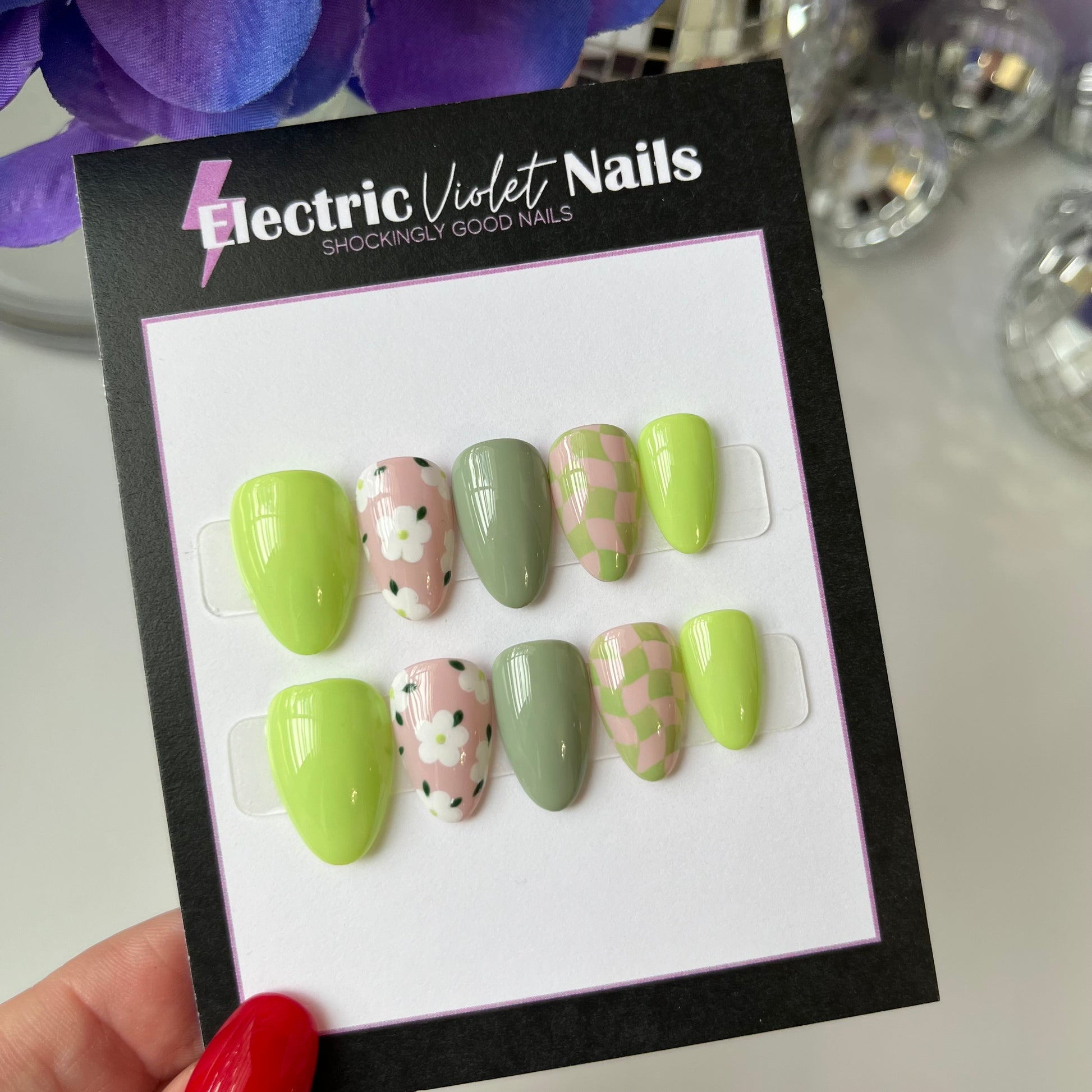 Set Description: Pale greens with flower and checker design press-on nail set.