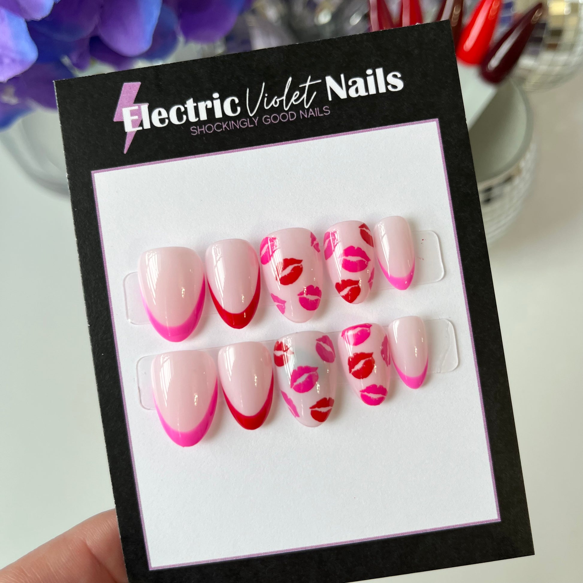 Set Description: Light pink nude base with hot pink and red French tips. Lipstick kiss design.