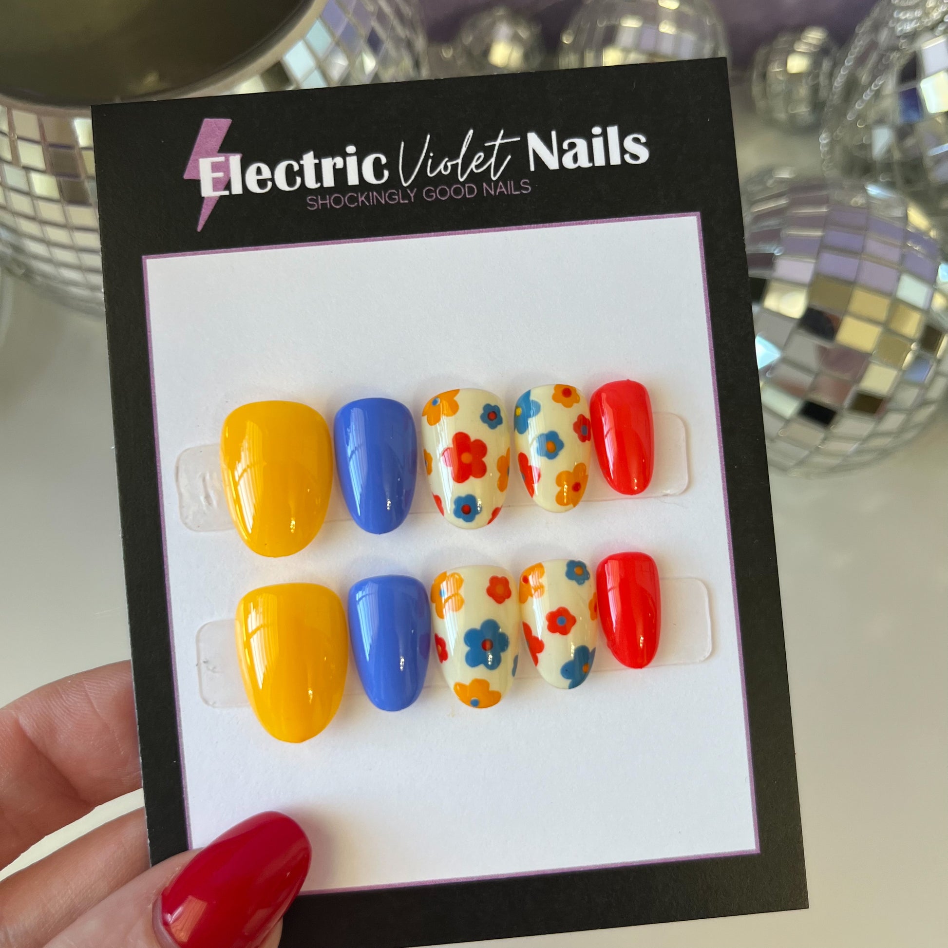 Blue, yellow, and orange floral press-on nail set.
