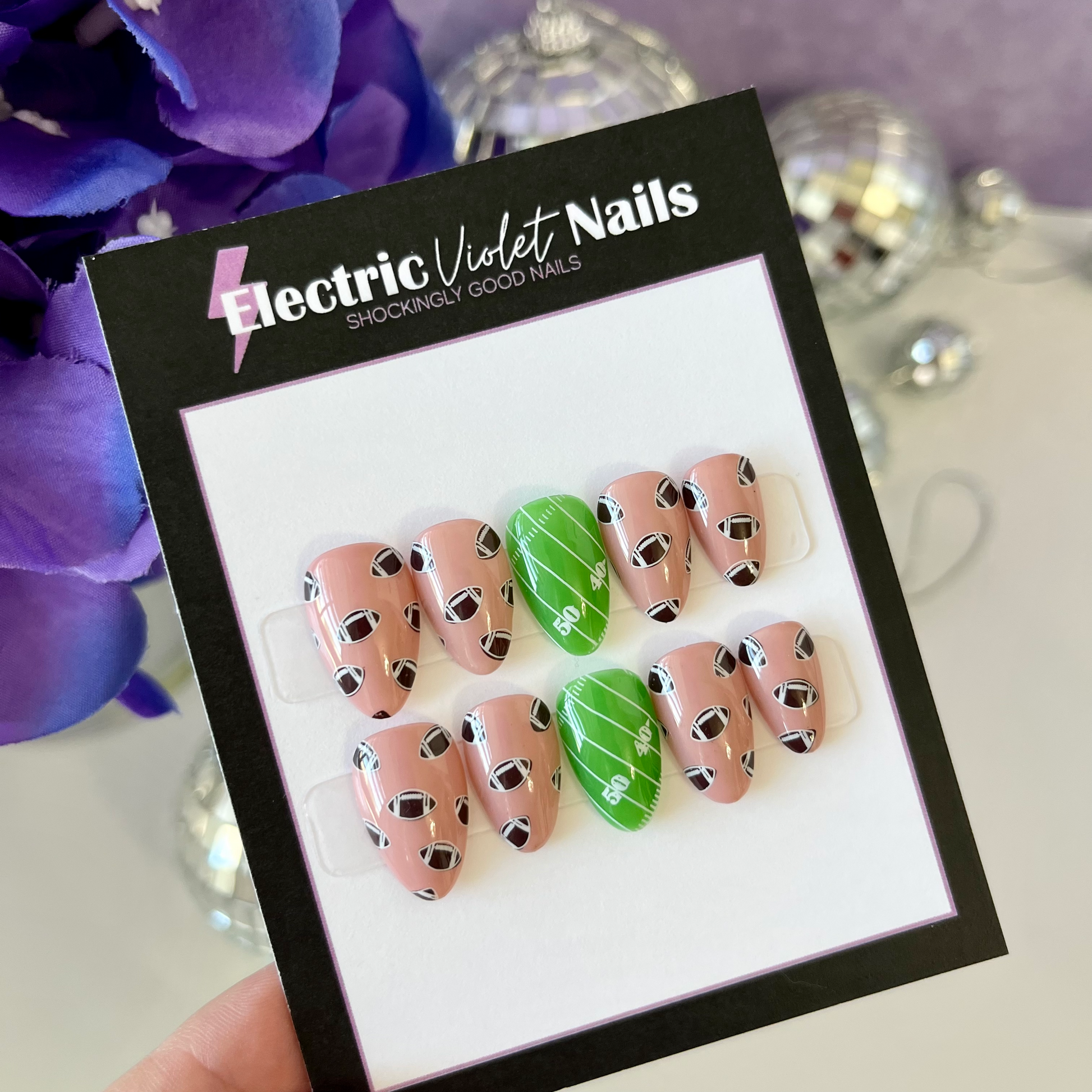 Set Description: Ready to score big fashion points? Look no further than Goalpost Glamour—the press-on nails that make slaying the game day style easy as a two-point conversion! These XS almond shaped nails feature a thermal color changing middle finger—turning from glorious green to sheer white in response to your team spirit! 🤩