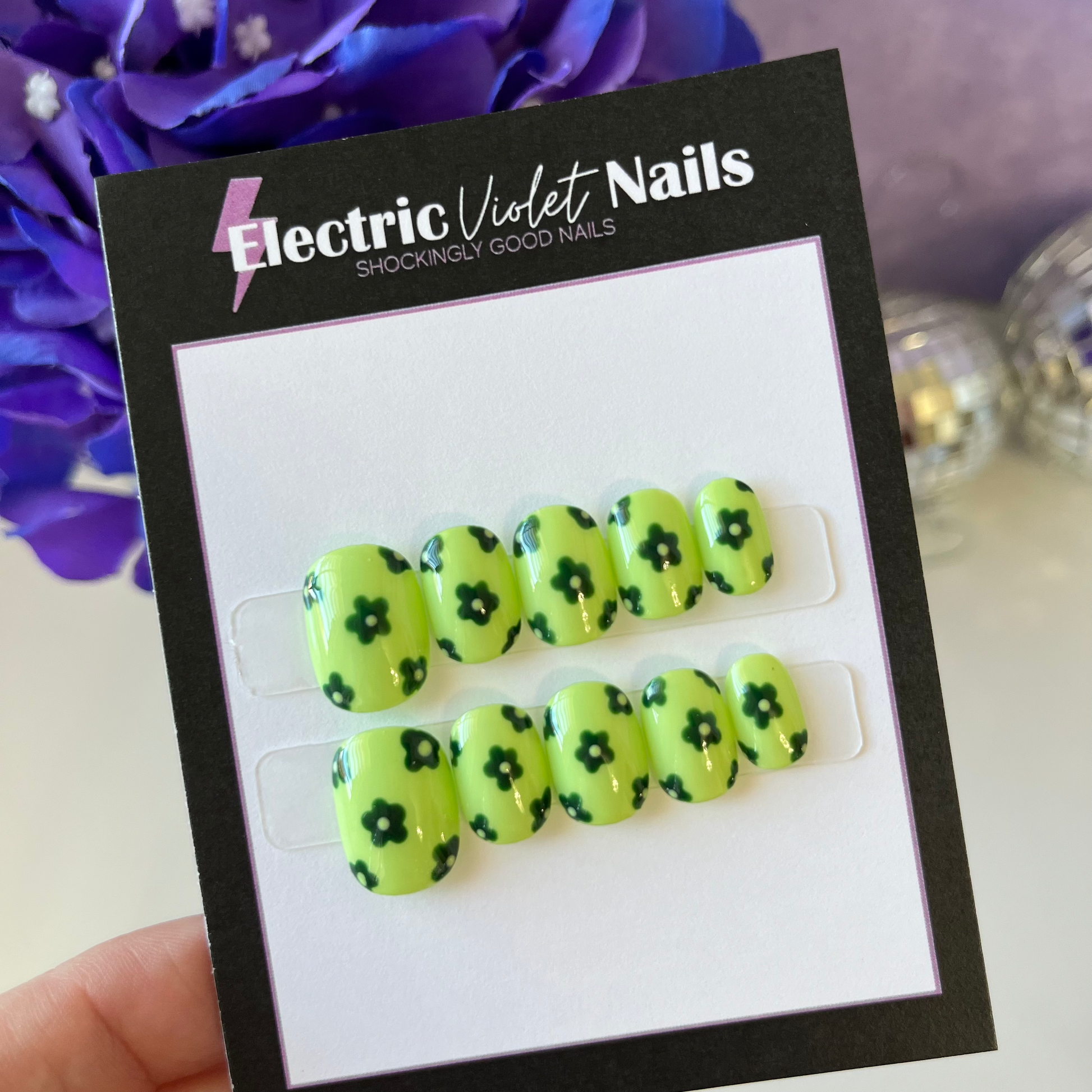 Description: This child press-on nail set features a lime green background and darker green flowers.