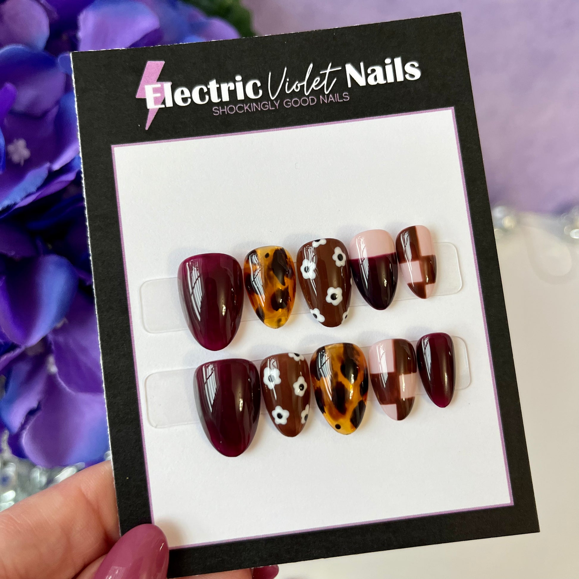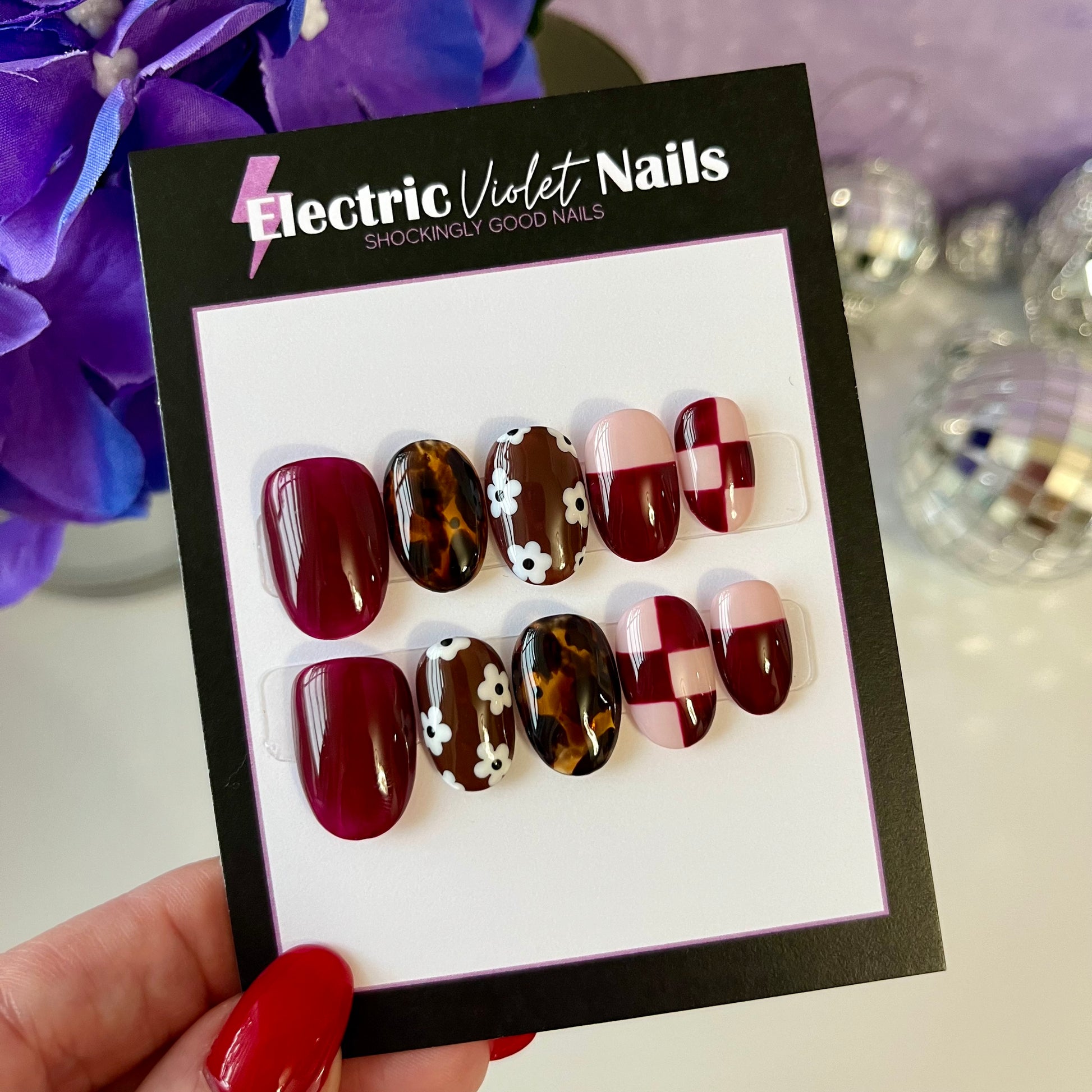 Set Description: Get an oh-so-marvelous manicure with this mixed nail set! Featuring a blend of maroon, floral, tortoise shell, and brown press-on nails. So scarlet it was maroon 💅