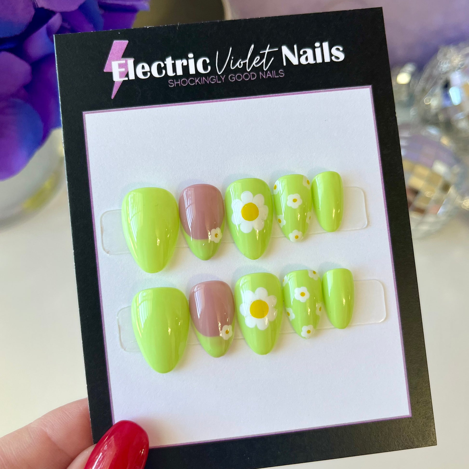 Get ready to add a pop of color to your fingertips with Lime Daisy press-on nails! These lime green nails feature playful daisy designs for a fun look. Easy to apply, these French tip nails will have you feeling confident and stylish in no time. Example set is XS Almond.