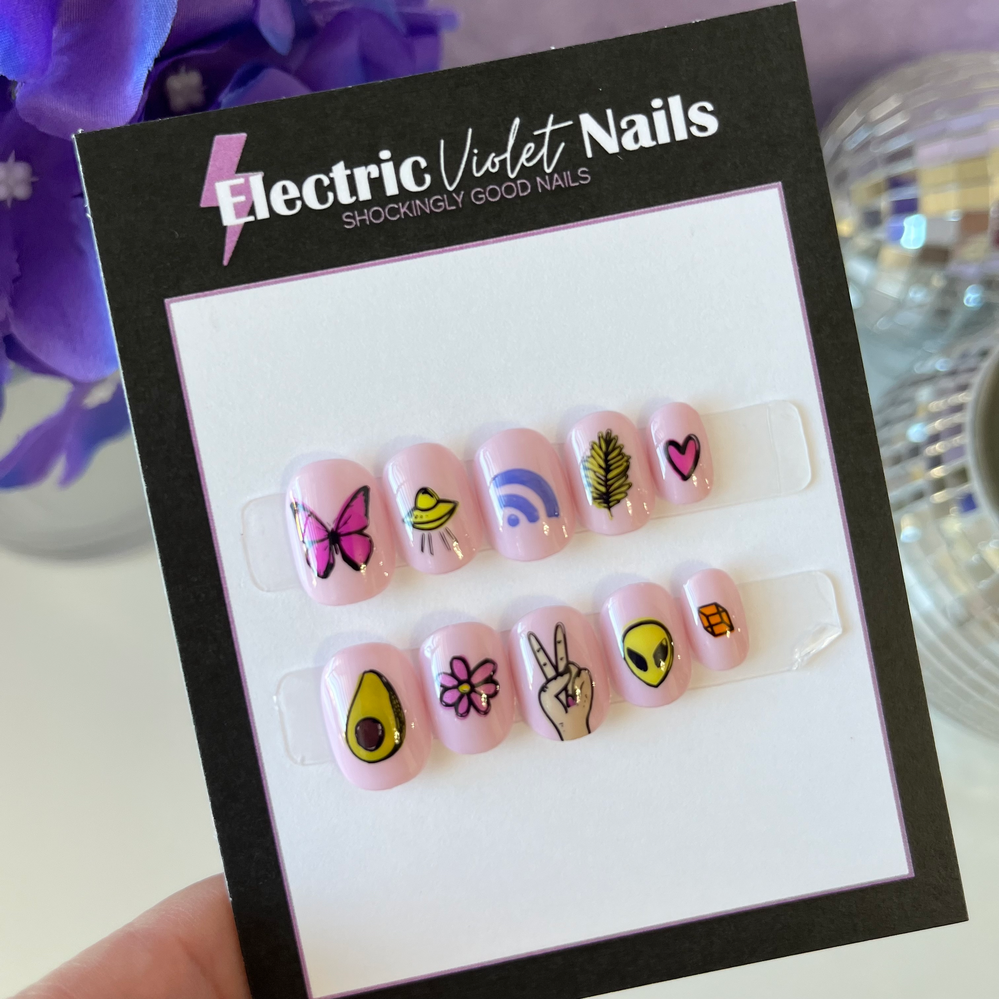 Description: This child press-on nail set features a light pink background with miscellaneous emojis: butterfly, alien, avocado, string, spaceship, wifi, prism, heart, flower, peace sign hand.