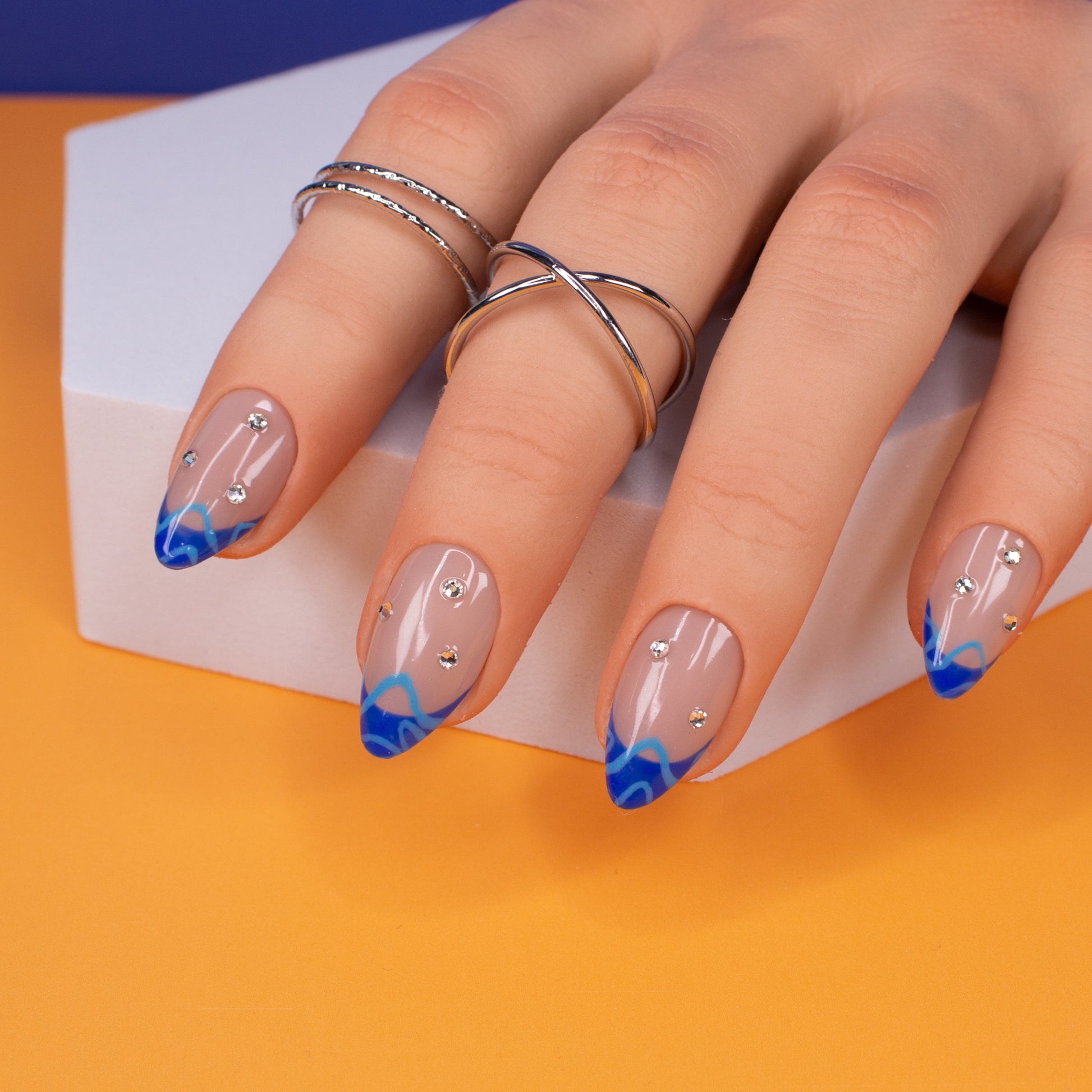 Set Description: Electric blue french tips with light blue swirls. Rhinestones for extra glam, because why not?