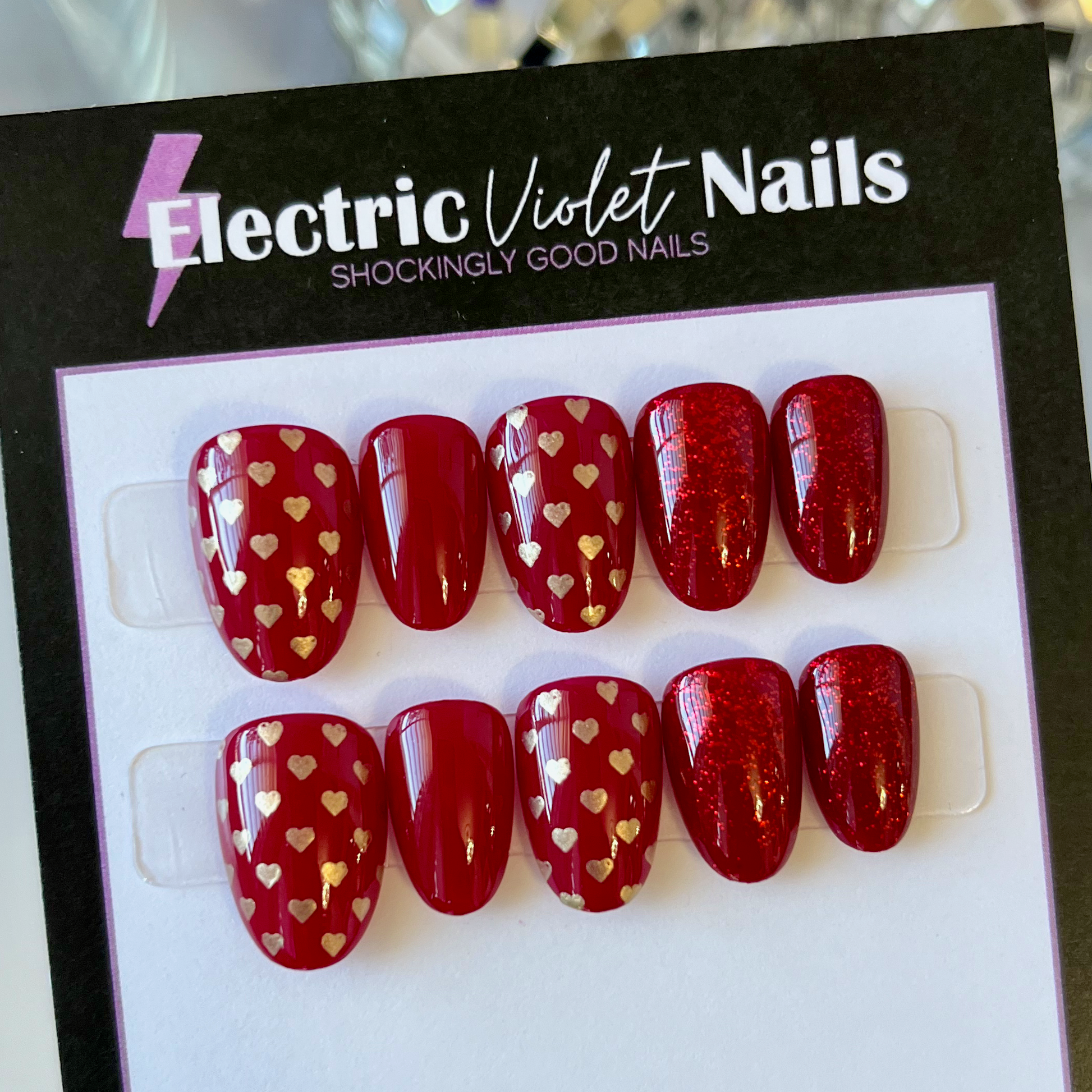 Set Description: Deep red base with gold heart design. Accent nails with red glitter.
