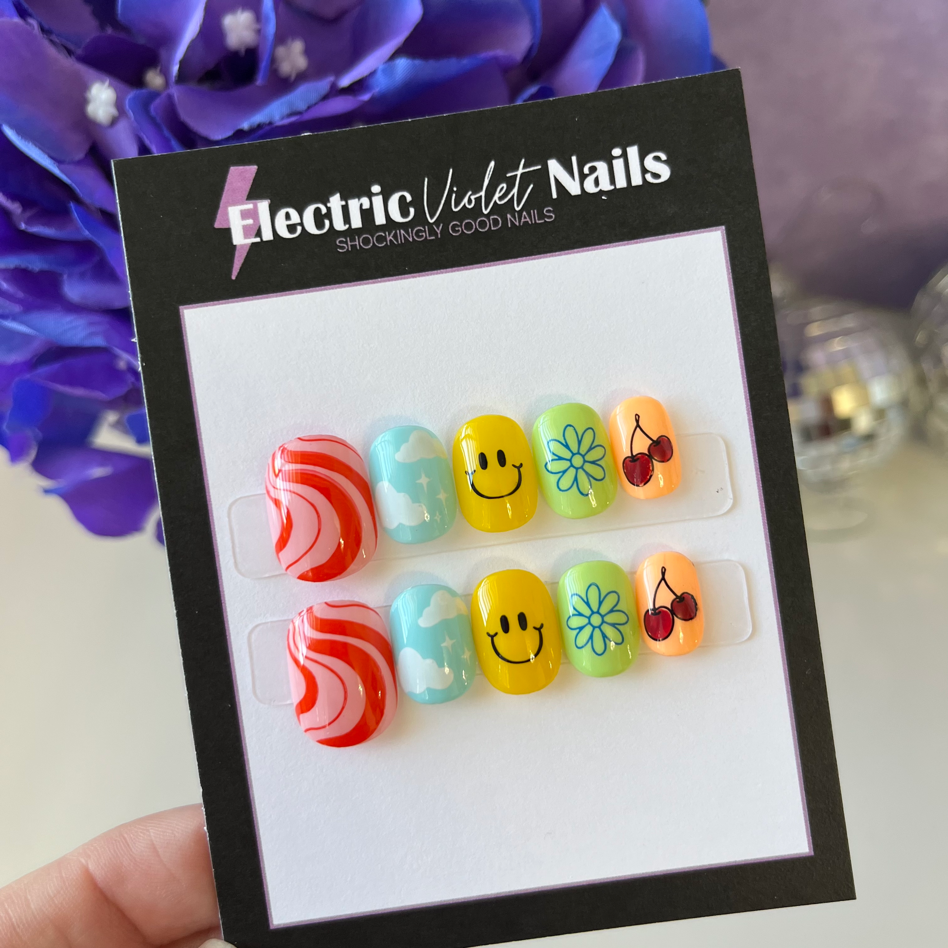 Description: This child press-on nail set features a mixture of smiley face, clouds, flowers, cherries, and swirls.