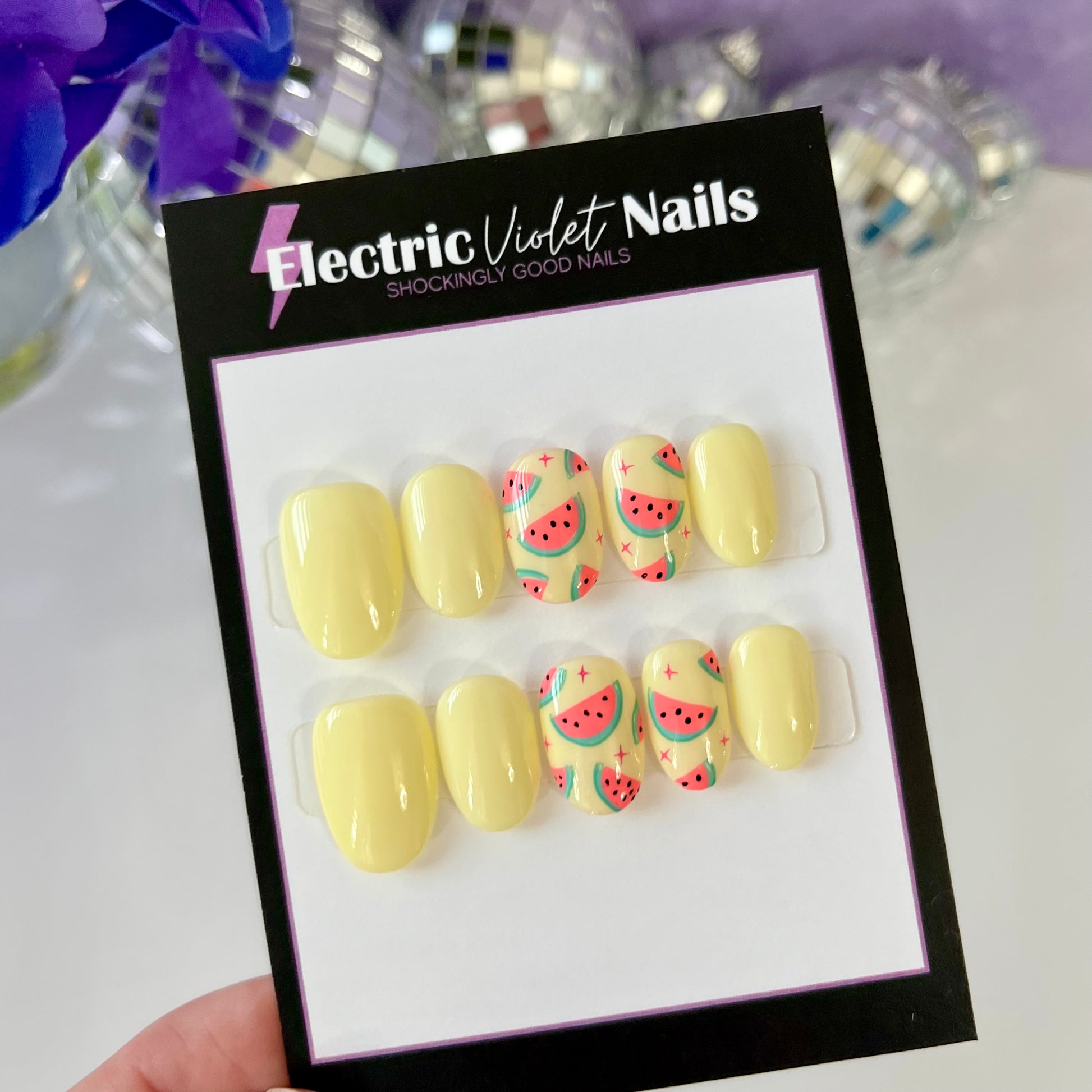 Set Description:  Ready for the sweetest summer? Our Watermelon Summer press-on nails make it easy to get into the spirit of the season. The pale yellow base is topped off with the juiciest watermelon art! Time to BBQ, rock the pool, and take advantage of this limited edition style! 🍉🌞