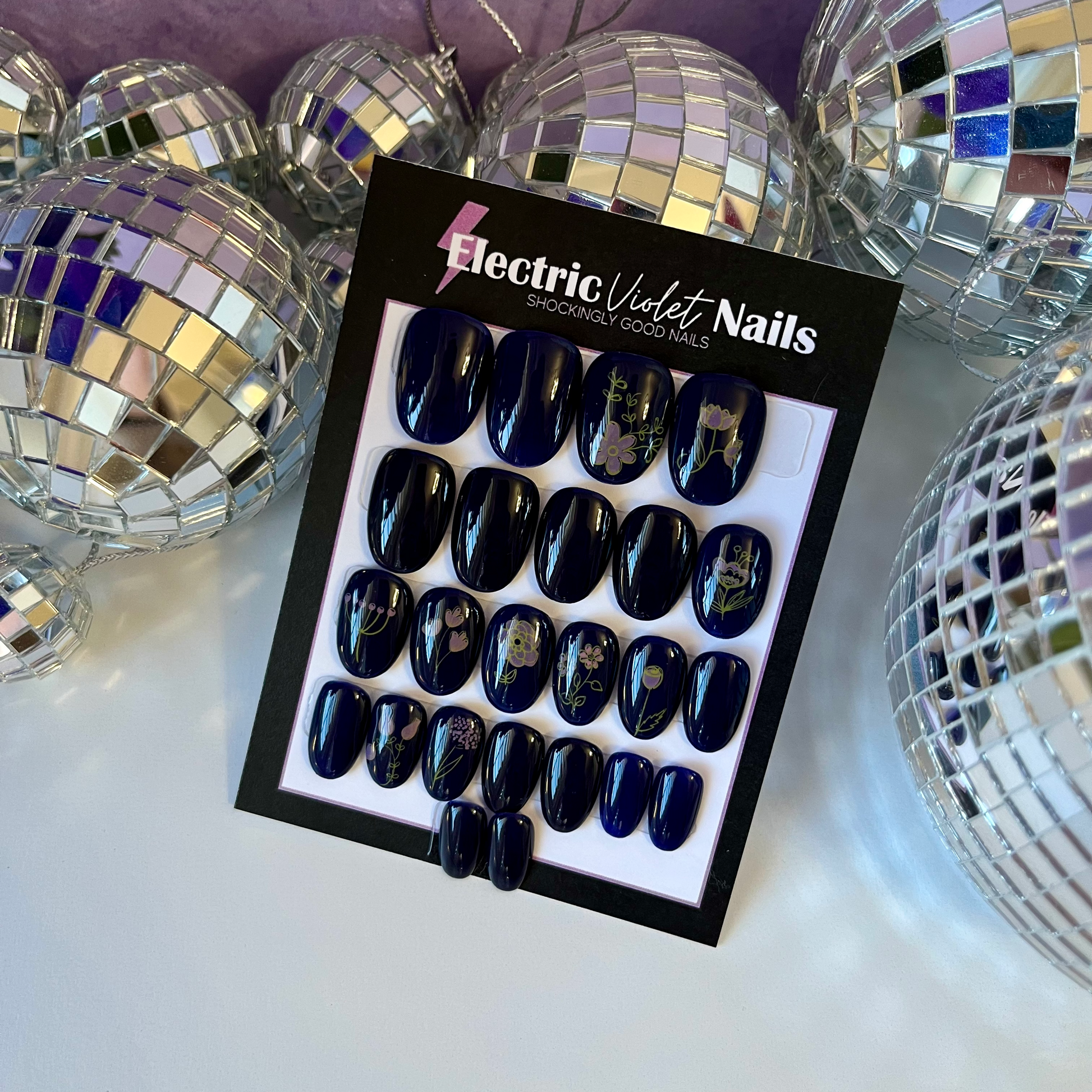 Description: Navy background with pink & green floral patterned press-on nail set.